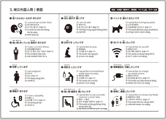 当灾害发生时,为了能在避难所用多种语言提供所需要的信息,仙台市政府制作的「灾害时多种语言表达手册」 在各避难所都有发放。