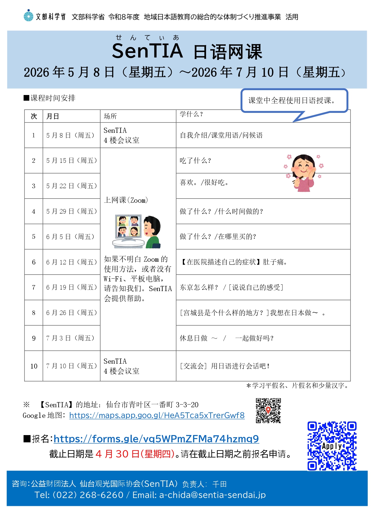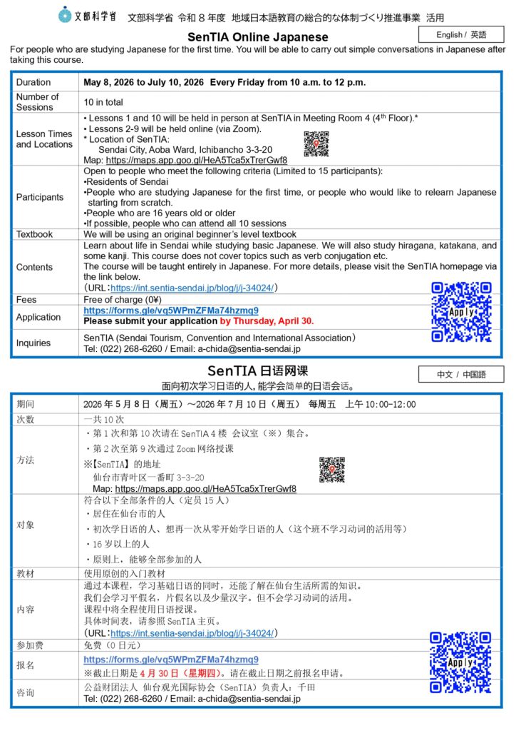 ■内容:通过本课程,学习基础日语的同时,还能了解在仙台生活所需的知识。