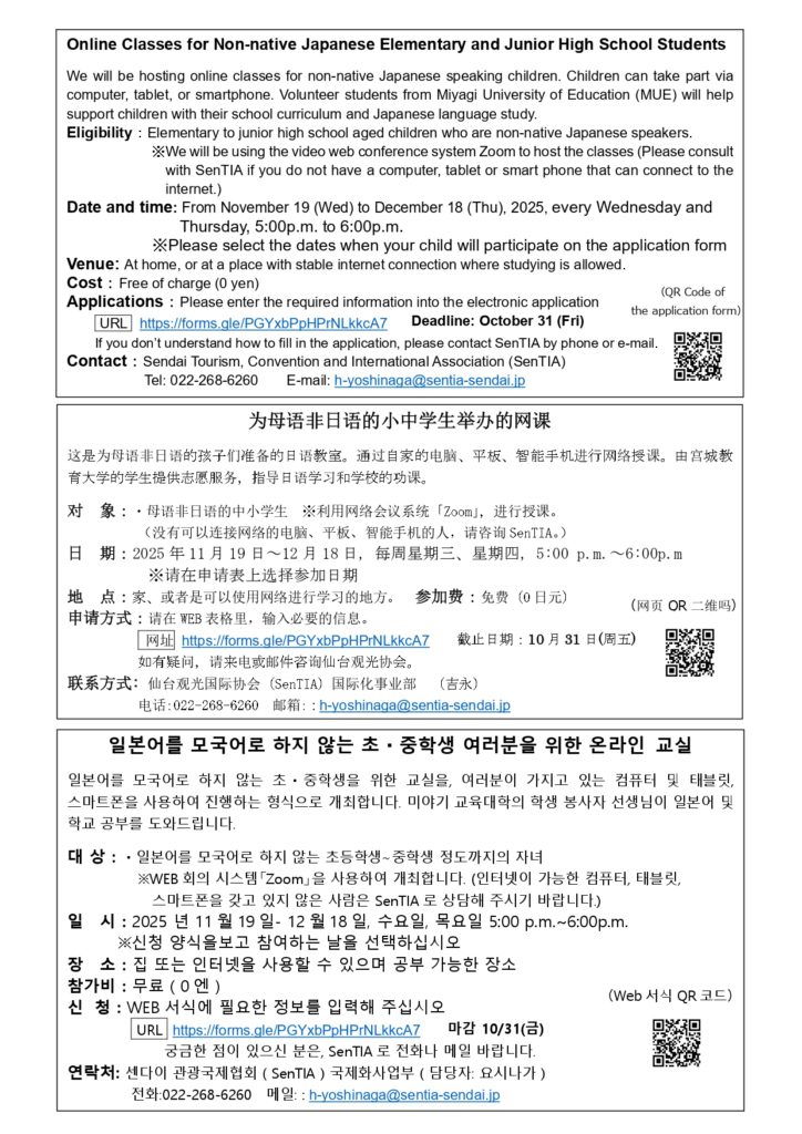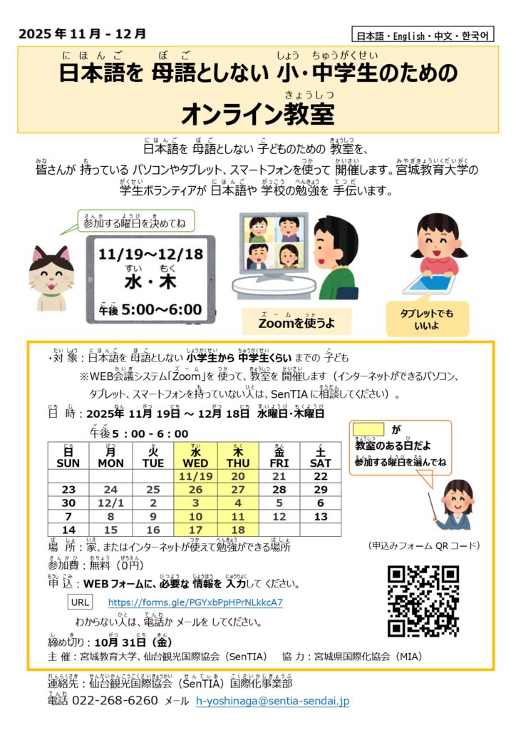 【참가자 모집】일본어를 모국어로 하지 않는 초・중학생 여러분을 위한 온라인 교실11월19일-12월18일(日本語を母語としない小・中学生のためのオンライン教室)