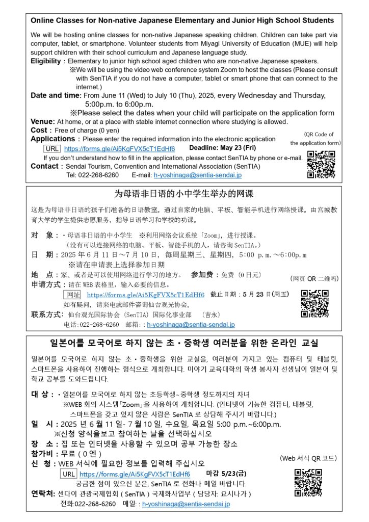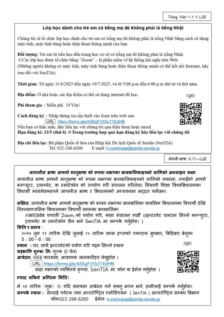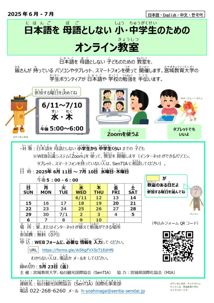 【SenTIA】 Lớp học trực tuyến dành cho học sinh tiểu học và trung học cơ sở có tiếng mẹ đẻ không phải là tiếng Nhật (từ ngày11/6/2025 đến ngày 10/7/2025)(日本語を母語としない小・中学生のためのオンライン教室)