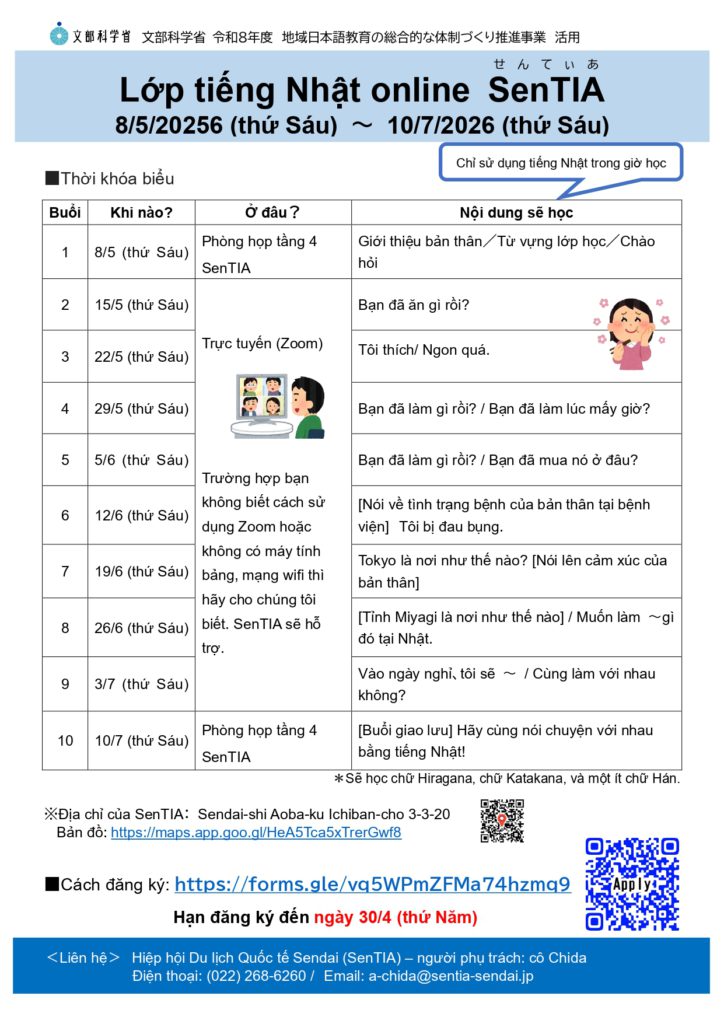 【Tuyển sinh】Tiếng Nhật trực tuyến SenTIA(từ 8/5/2026 đến 10/7/2026 )/(SenTIAオンラインにほんご)