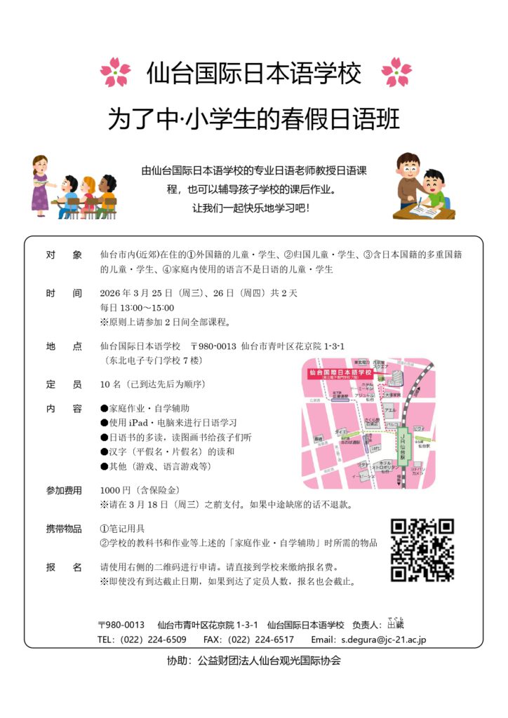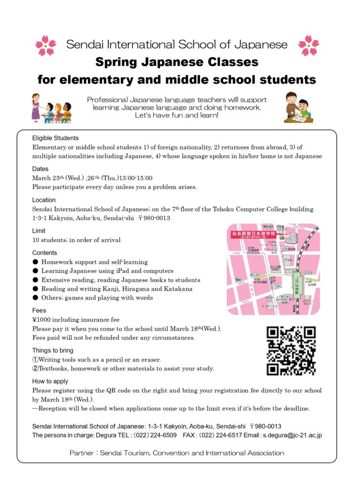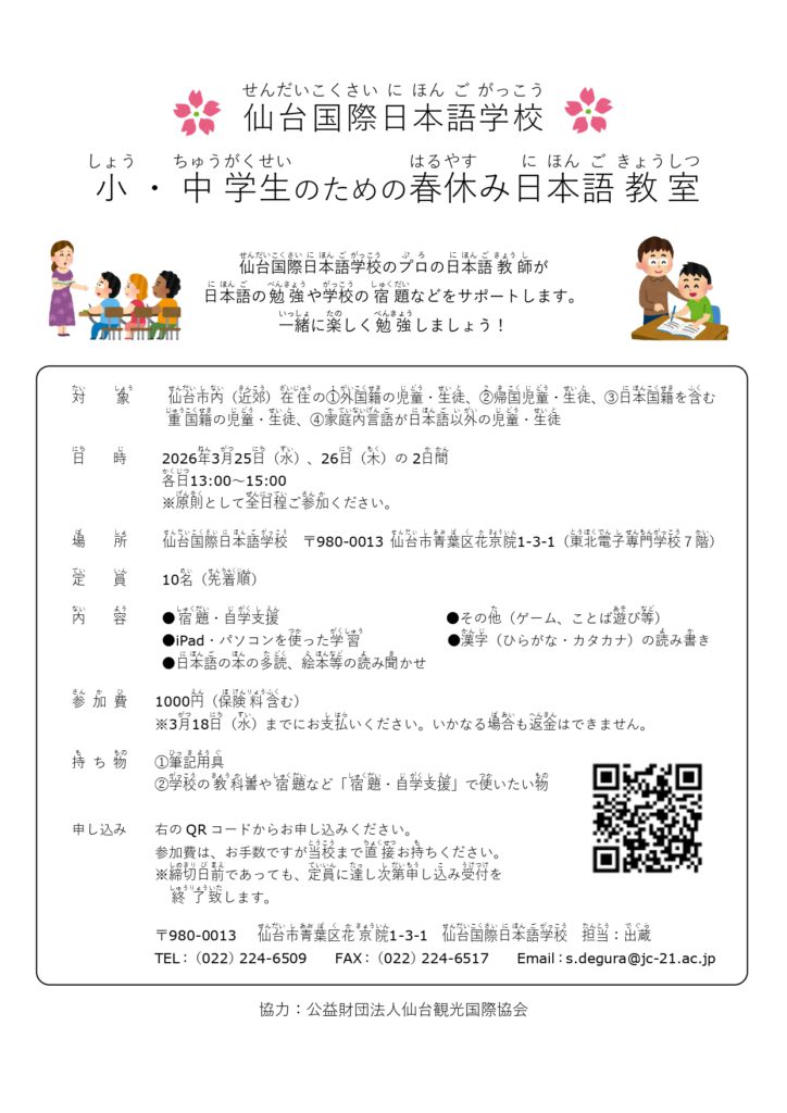 【情報提供】小・中学生(しょう・ちゅうがくせい)のための春休み日本語教室(はるやすみにほんごきょうしつ)(仙台国際日本語学校主催/3月25日、26日)
