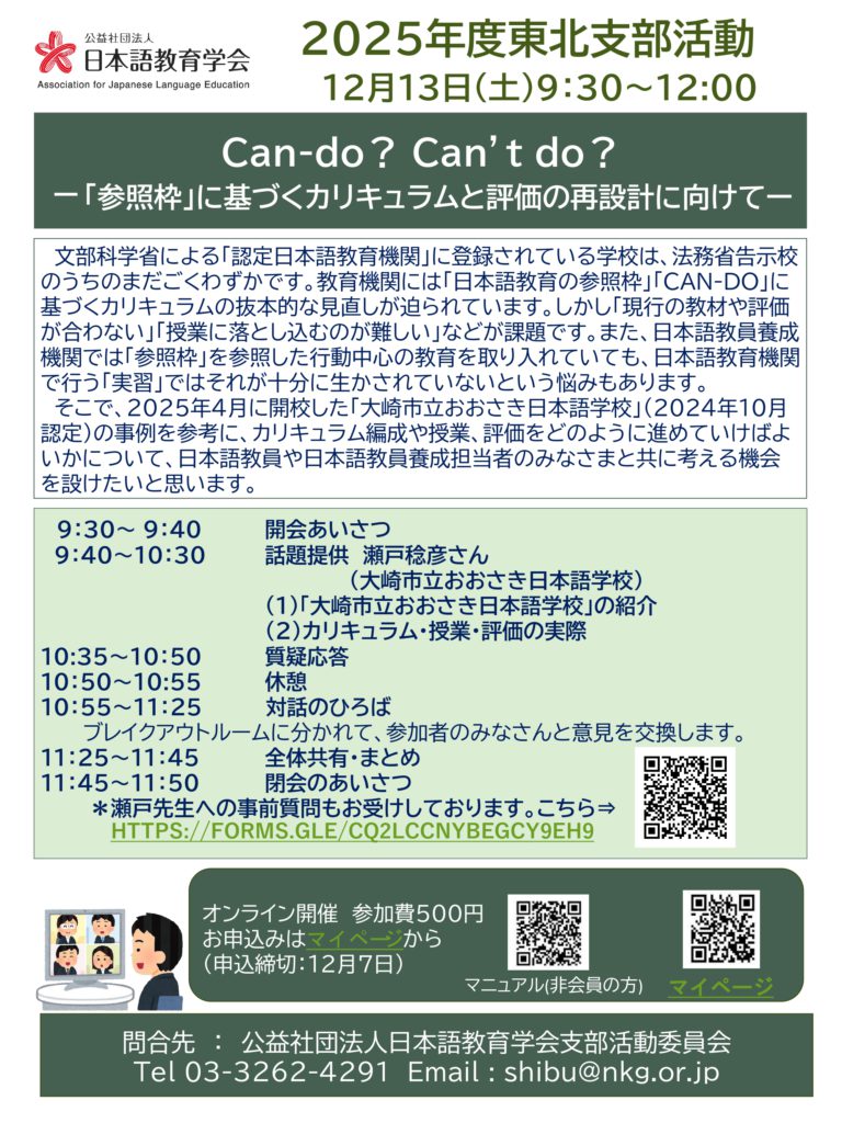 【情報提供】2025年日本語教育学会東北支部活動「Can-do? Can’t do? ―「参照枠」に基づくカリキュラムと評価の再設計に向けて―」(日本語教育学会支部活動委員会主催/12月13日)