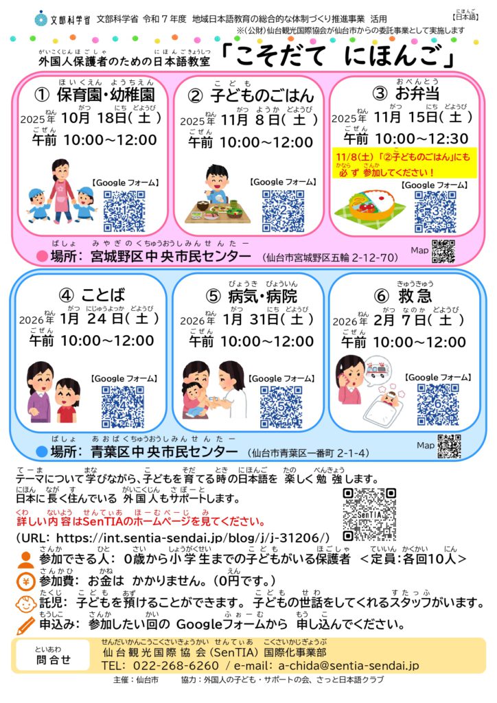 【内容】子(こ)どもの予防接種(よぼうせっしゅ)や病院(びょういん)に行(い)く時(とき)のことを知(し)っていますか。元気(げんき)に暮(く)らすための日本語(にほんご)を勉強(べんきょう)します。仙台市(せんだいし)の保健師(ほけんし)の話(はなし)を聞(き)くことができます。