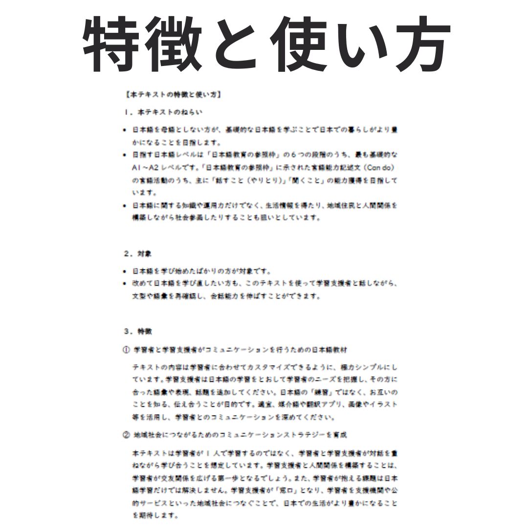 本テキストはこの講座で使用するために開発されたものです。基礎的な日本語や生活情報を学ぶことで、「外国人」住民(学習者)が日本での生活を豊かなものとし、社会参画していけることを目指しています。また、学習者と学習支援者が日本語学習を通じて対話し、お互いのことを知り、学び合う喜びを感じることにつながれば幸いです。